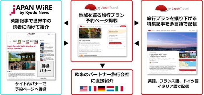共同通信デジタルは、一般社団法人共同通信社の英語ニュースサイト「Japan Wire」で地域の文化や自然、歴史などの魅力を紹介する特集記事広告を発信する。ジャパン・トラベルは、同社の外国人ガイドが対象の地域を訪問し、旅行者目線による旅行プランを作成し、予約機能がある専用ウェブサイトに、英語、フランス語、ドイツ語、イタリア語で掲載する。さらに、ジャパン・トラベルが連携する欧米の旅行事業者に、旅行プランを提供することで、訪日観光客の誘致につなげる導線を構築する。