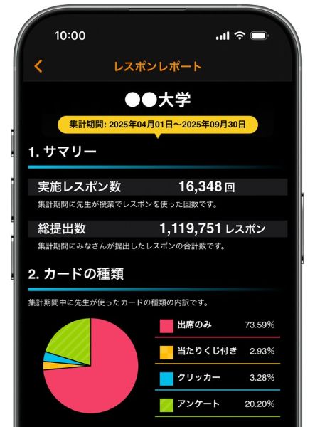 今回、新機能として学生が利用するアプリで、2025年度前期の利用レポート(レスポンレポート)を公開。提出件数に加え、深夜の利用状況など、学校全体の利用を把握できる項目を掲載。定期的に公開するという。