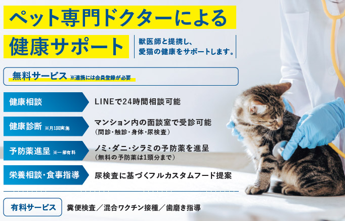 ペット専門ドクターと提携し、入居者はドクターへの健康相談や診断サービスを年4回まで無料で受けられるほか、LINEを通じて24時間相談することもできる。全戸にペットカメラや環境センサーを設置しており、外出先から室温管理や愛猫の様子を確認することも可能だという。
