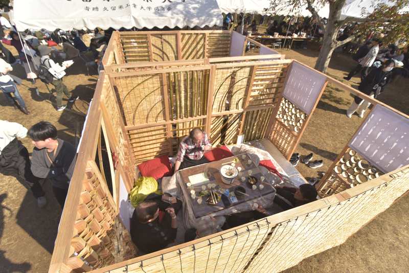 昨年から事前予約できる有料の休憩スペースを設け、仮設テントにテーブルやいす、食事を温める七輪を設置した。今年はこたつを置いた「お座敷」も設営。空間の仕切りには、放置竹林の竹を使って、学生が「和・伝統」を表現した。